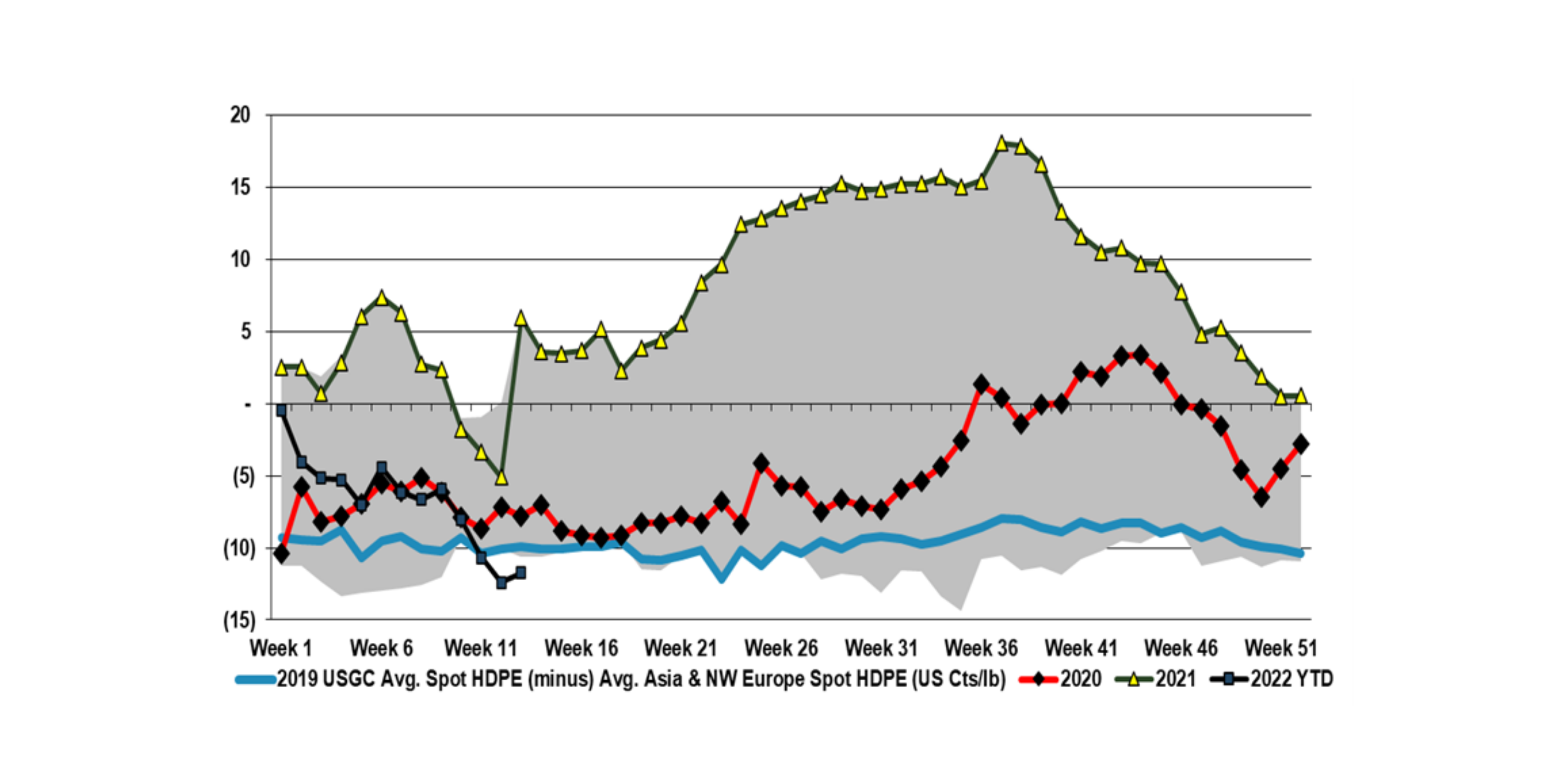 Global Market Analysis Hot N Cold – US PE Price Premiums Have Turned To Discounts, High Prices Abroad Benefit US Producers US spot polyethylene (PE) prices declined from a historic market premium relative to avg. NW Europe and Asia prices in 2021 to now reflect a April 5, 2022 No Comments