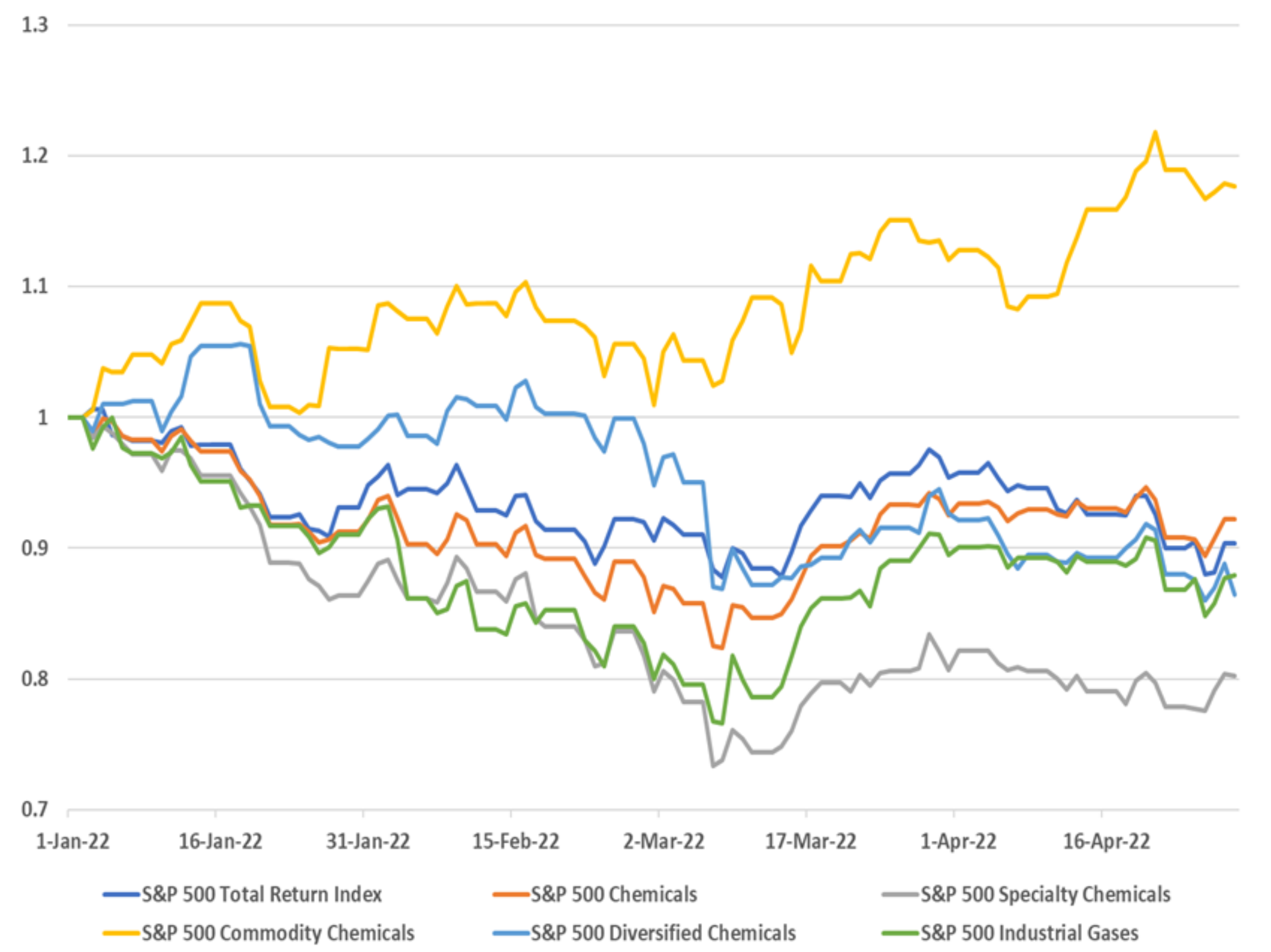 Global Market Analysis Pause – Commodity Equities May Take A Breather Here, Despite Compelling Long Term Fundamentals US commodity chemicals outperformed YTD, but we think a price/margin pullback among these producers is likely in 2H22. We argue that US specialty sub-sector equities April 29, 2022 No Comments