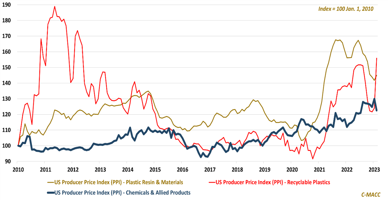 Global Market Analysis Need You Now – Recycled Resin Wholesale Prices Surge Relative To Virgin, Lifting Buyer Substitution Challenges The PPI for recycled resin surged MoM in February to reflect a level above the plastic resin & materials index, a near-term plus for recyclers March 15, 2023 No Comments