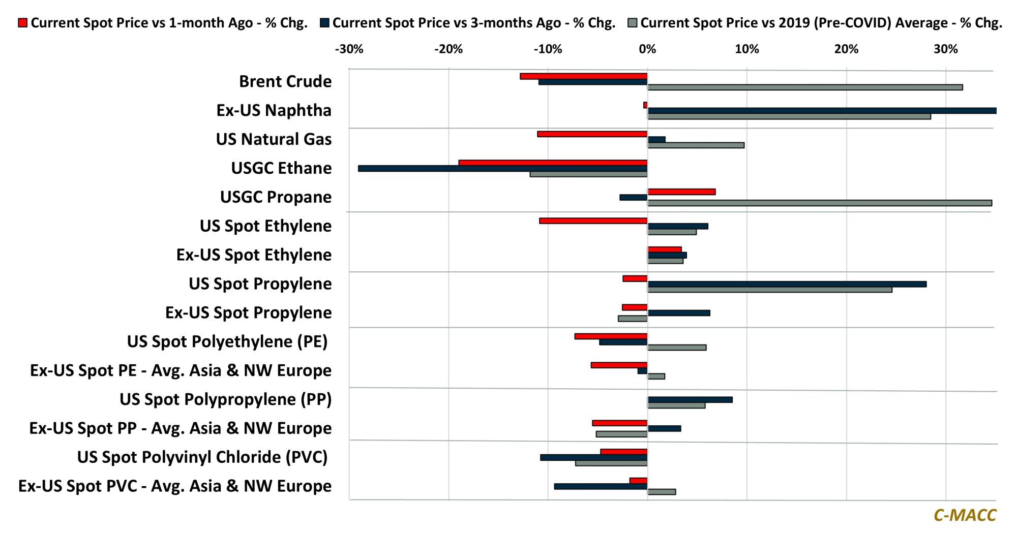 - US ethylene production economics, based on ethane feedstock, held up WoW, as cost deflation helps support domestic ethylene profit and integrated domestic polymer margins despite lower prices.