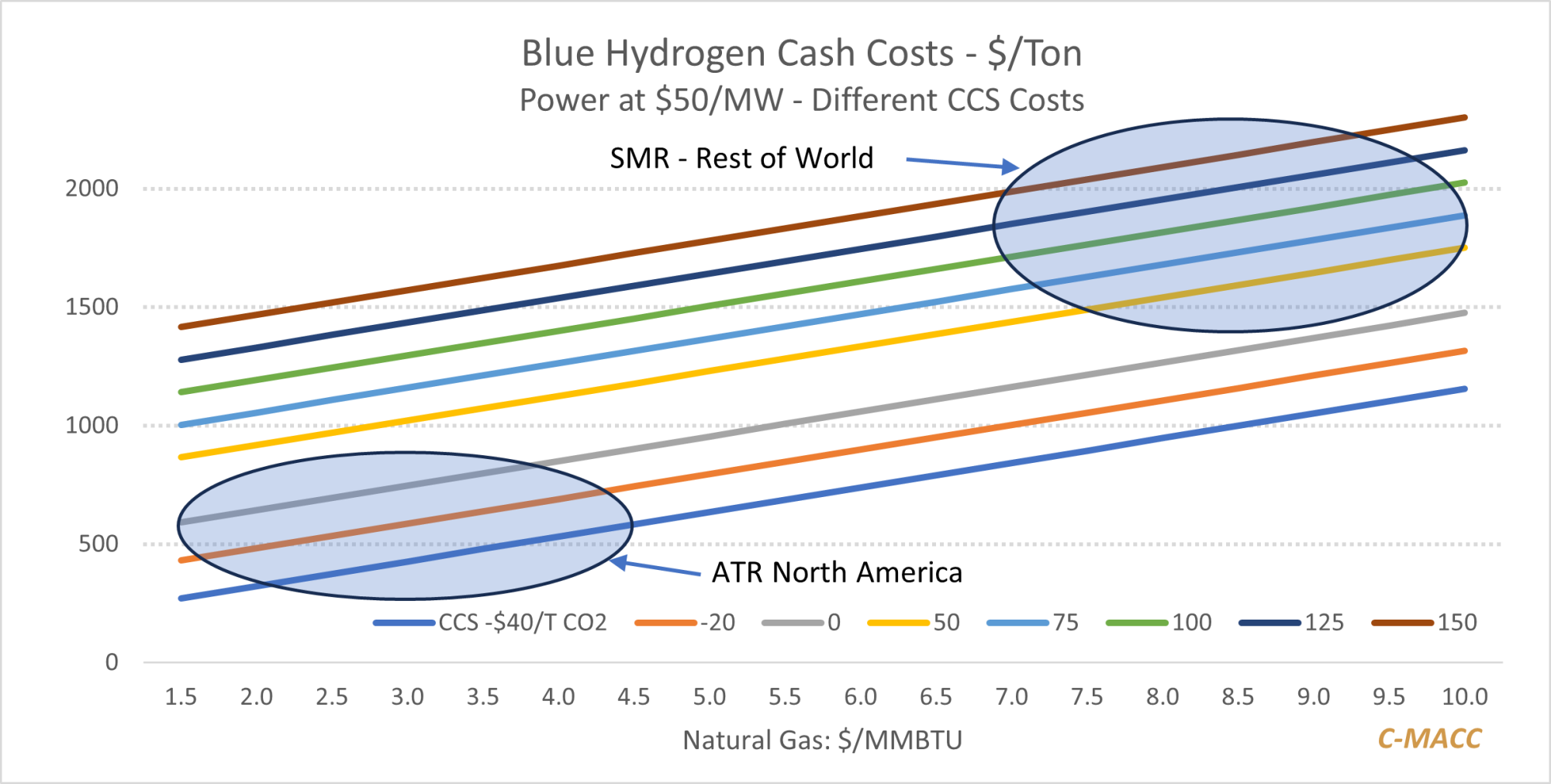 The chart below shows what looks like an insurmountable difference between the economics of making blue hydrogen in North America compared to the rest of the world. This results from two factors – a credit for CCS in the US, and what that credit allows you to do with technology. The 45Q credit in the US is based on the CO2 you sequester rather than the product you make, and consequently, a technology that allows you to capture the CO2 more easily but produces much more of it can be a positive if you can keep capture and sequestration costs down. The lines in the chart below represent different carbon capture costs, from as low as a $40 per ton credit in the US to as high as $150 per ton in some of the higher-cost European locations. The break in the lines is a switch between ATR technology, which can produce as much as 11 tons of CO2 per ton of hydrogen (we are using 8), and SMR technology, which makes between 5 and 6 tons of CO2 per ton of hydrogen but whose cost of capture is higher. These are cash costs – financing costs range from a low of $1.2/KG to a high of $5-6/KG. The best-case US is 6x cheaper than the higher-cost alternatives where there are no carbon credits. This is not an exact comparison, because in many countries, you are offsetting a carbon tax or other cost, which should be used as an offset, but this is hard to generalize as it would depend on the use of the hydrogen. Decarbonizing steel in Europe may have the highest offset, for example. We use North America in the analysis below as we are giving Canada the benefit of the doubt for the proposed carbon tax break that is under discussion.