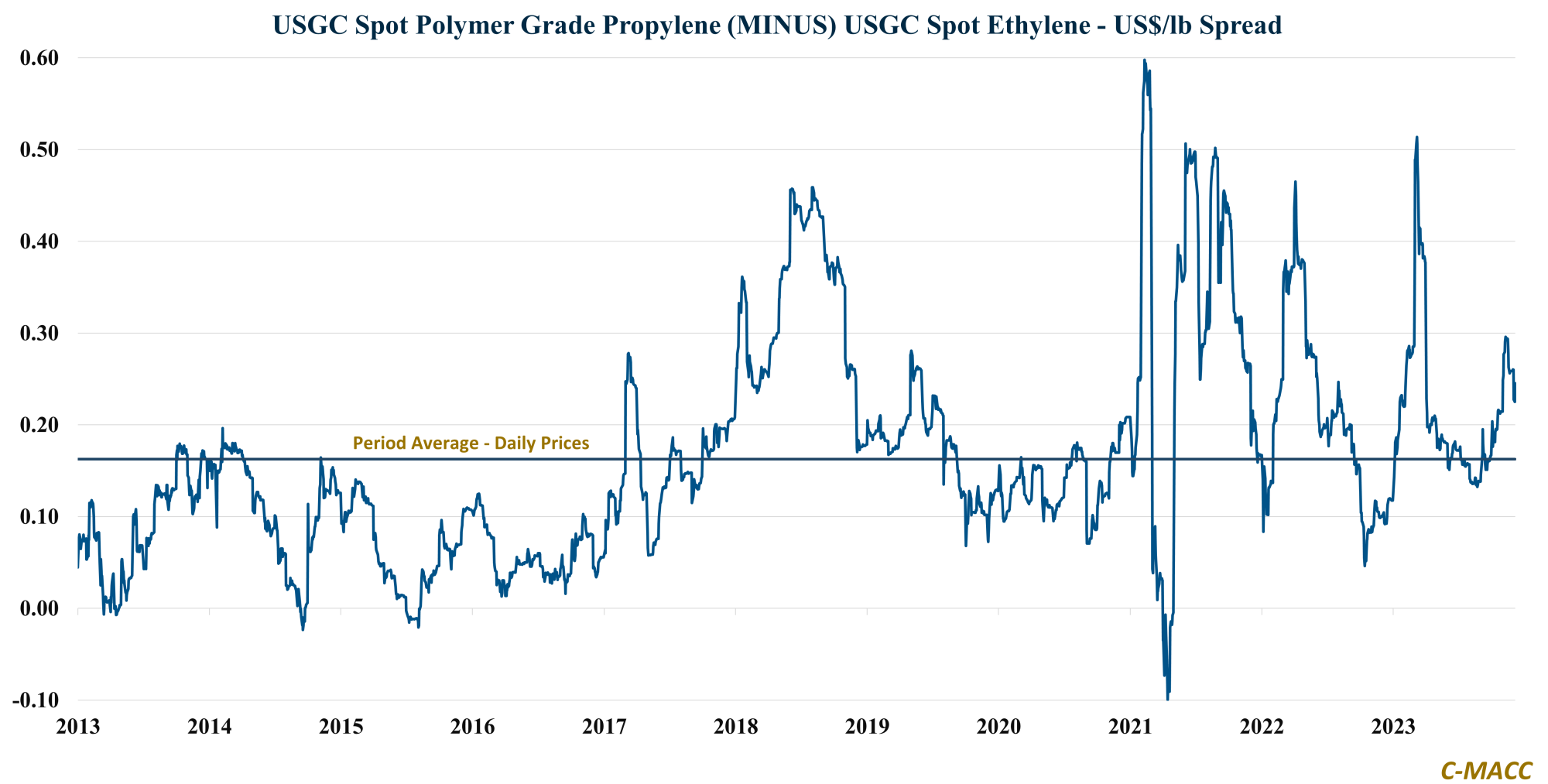 Exhibit #1: US spot PGP commands a premium above its 10-year average compared to ethylene and is likely to stay at an elevated relative level, especially if PDH production issues persist.