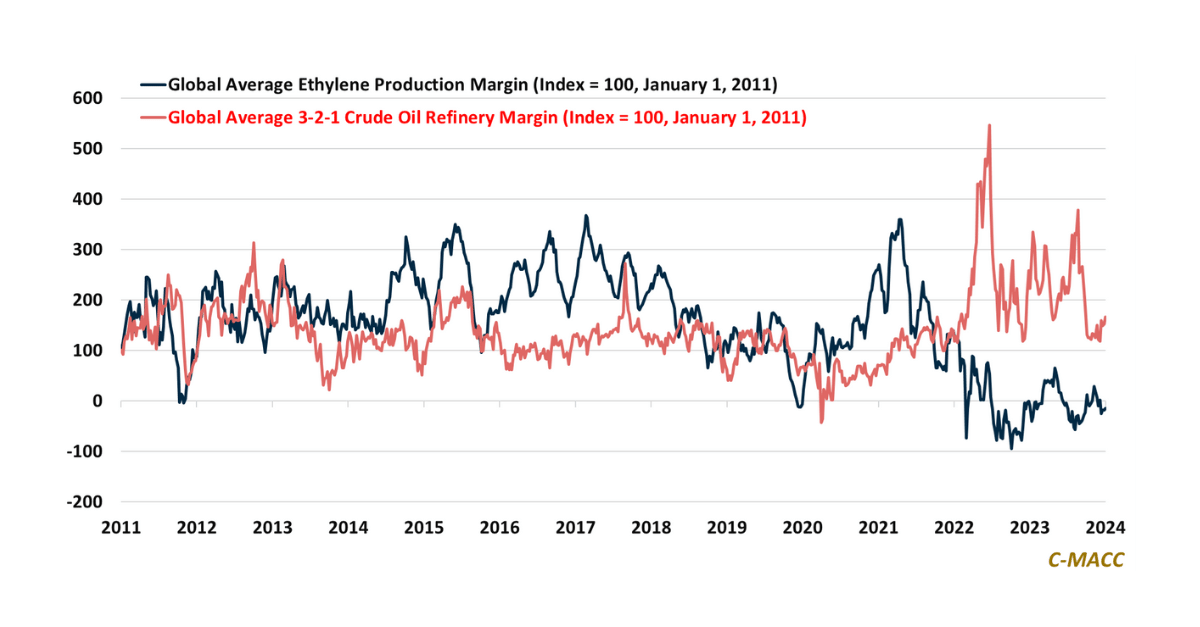 Global Market Analysis The Pain, The Gain, & Becoming The Same –Energy & Chemical Destinies To Further Merge C-MACC Co-Founder Graham Copley will host a webcast to discuss the global ethylene market, likely rationalizations, and the China factor on January 9 at 9 January 5, 2024 No Comments