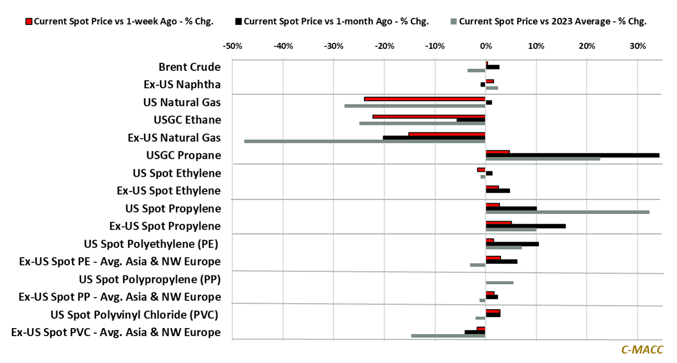 • Feedstock Market Trends: Brent Crude and ex-US naphtha values reflected more support WoW than global natural gas and US ethane – North American costs, on average, benefited WoW relative to Asia and Europe.