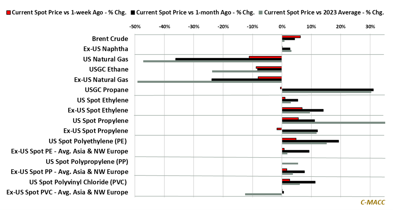 - Polymer Market Trends: Western PE prices rose relative to Asia WoW, notably benefiting North American integrated PE producer margins. Global PP values were mostly unchanged, and US spot PP fell below PGP.