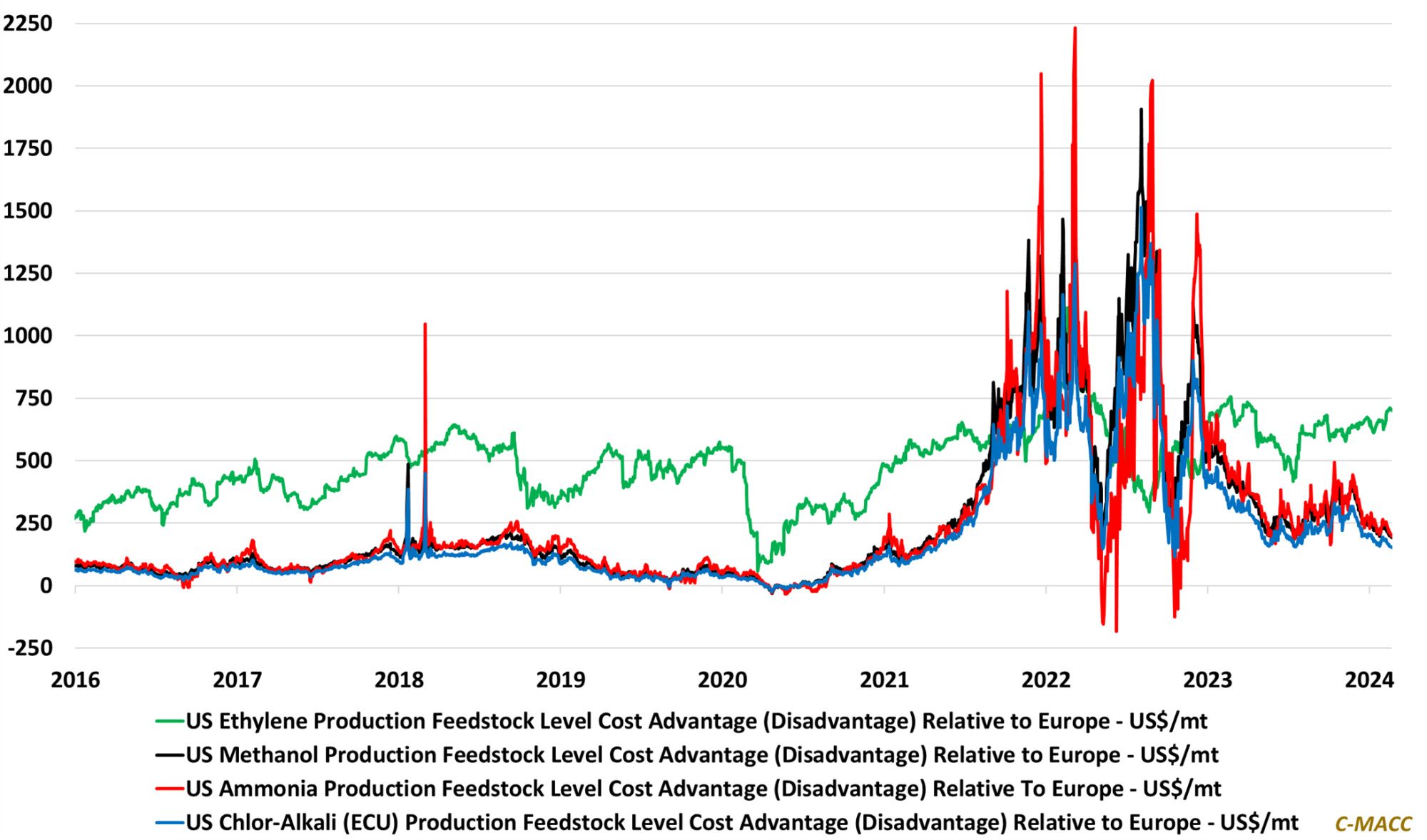 Exhibit 1: The US ethylene production cost advantage relative to Europe has moved in the opposite direction YTD of its methanol, chlor-alkali, and ammonia advantage as crude oil has held up while global natural gas prices weakened.