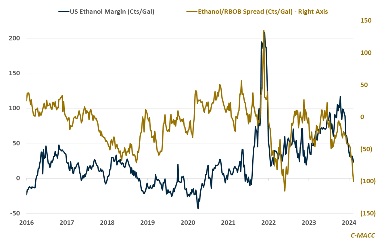 Exhibit 1: US ethanol production margins sunk to a YTD low last week, hitting a level last seen in 4Q22.