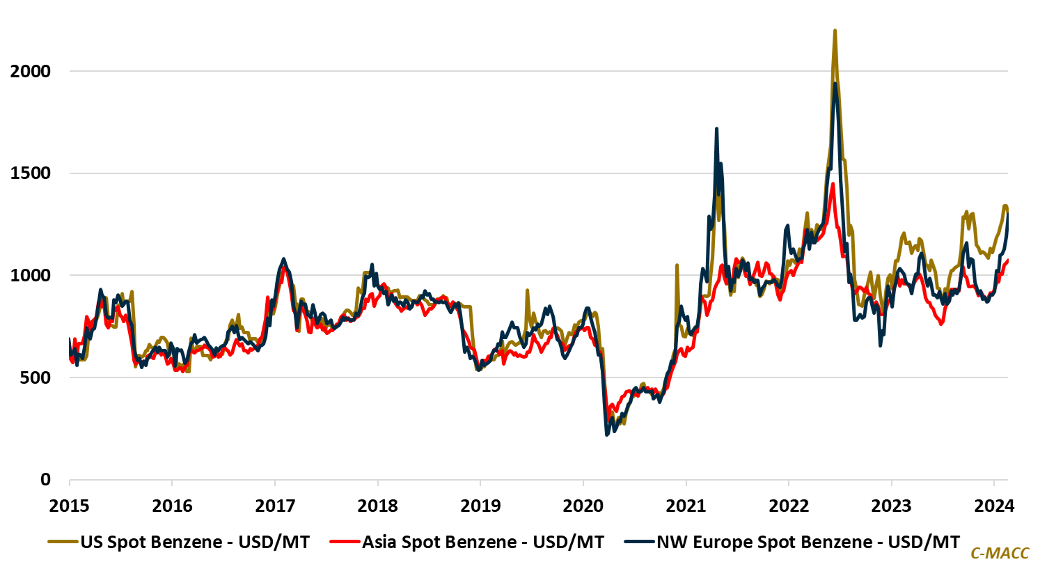 - General Thoughts: Western spot propylene and benzene prices have risen to a sizable premium relative to Asia YTD – a plus for Western manufacturers and integrated product makers but an issue for its non-integrated buyers.