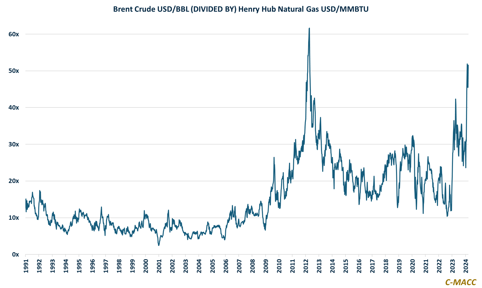 Exhibit 1: Global crude oil investments have slowed, in part because of investor hostility, while US gas is abundant. In 1Q24 oil prices rose to their highest levels relative to US natural gas since 2012, which was caused by a short shock.