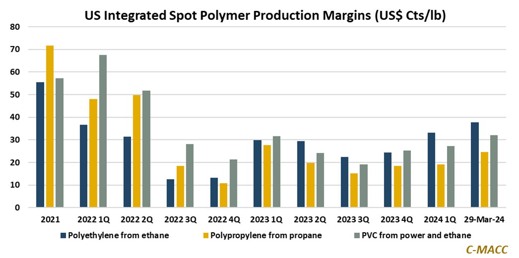 - Polymer Market Trends: US integrated spot polymer margins leaped higher in 1Q24 compared to 2H23 levels and closed the quarter above their 1Q average despite reversing spot price momentum for most in late March.