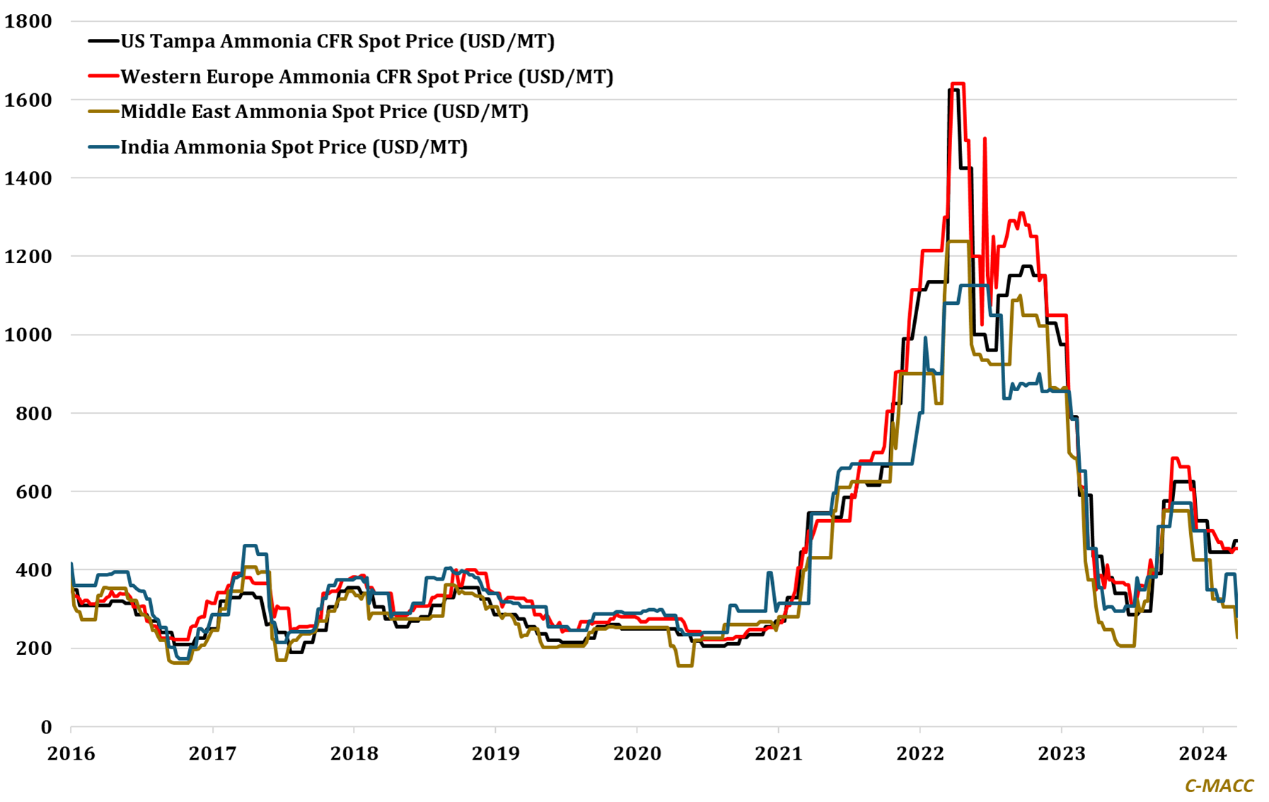 Exhibit 1: Western ammonia prices held up into 2Q24; global indicators suggest downward pressure on prices ahead.
