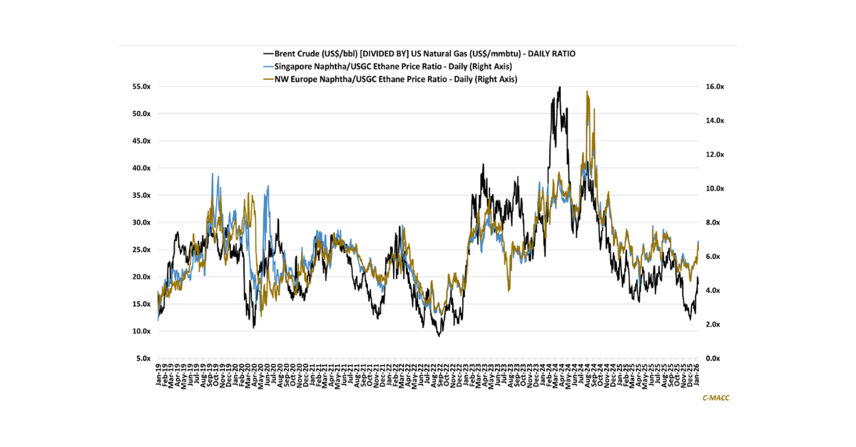 • Energy/Upstream: The weakness in Europe and Asia natural gas prices relative to Brent Crude and US natural gas is likely to stimulate downstream production, such as ammonia in Europe, but the benefits may prove short-lived.