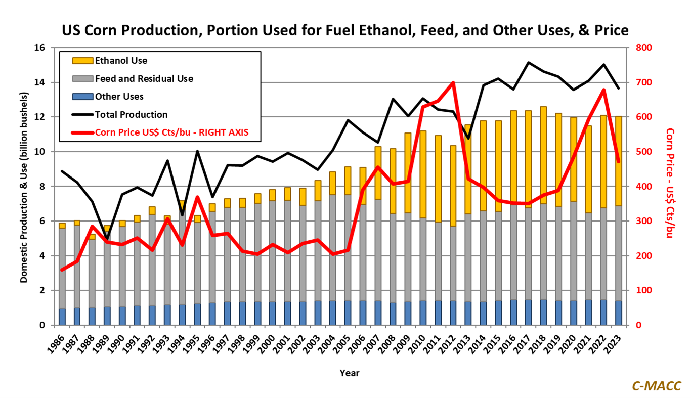 Exhibit 1: The increased consumption of corn in ethanol spurred corn prices higher from 2005-2012, while feed and residual use for corn relatively declined. Rising bioproduct demand later this decade favors crop price support.