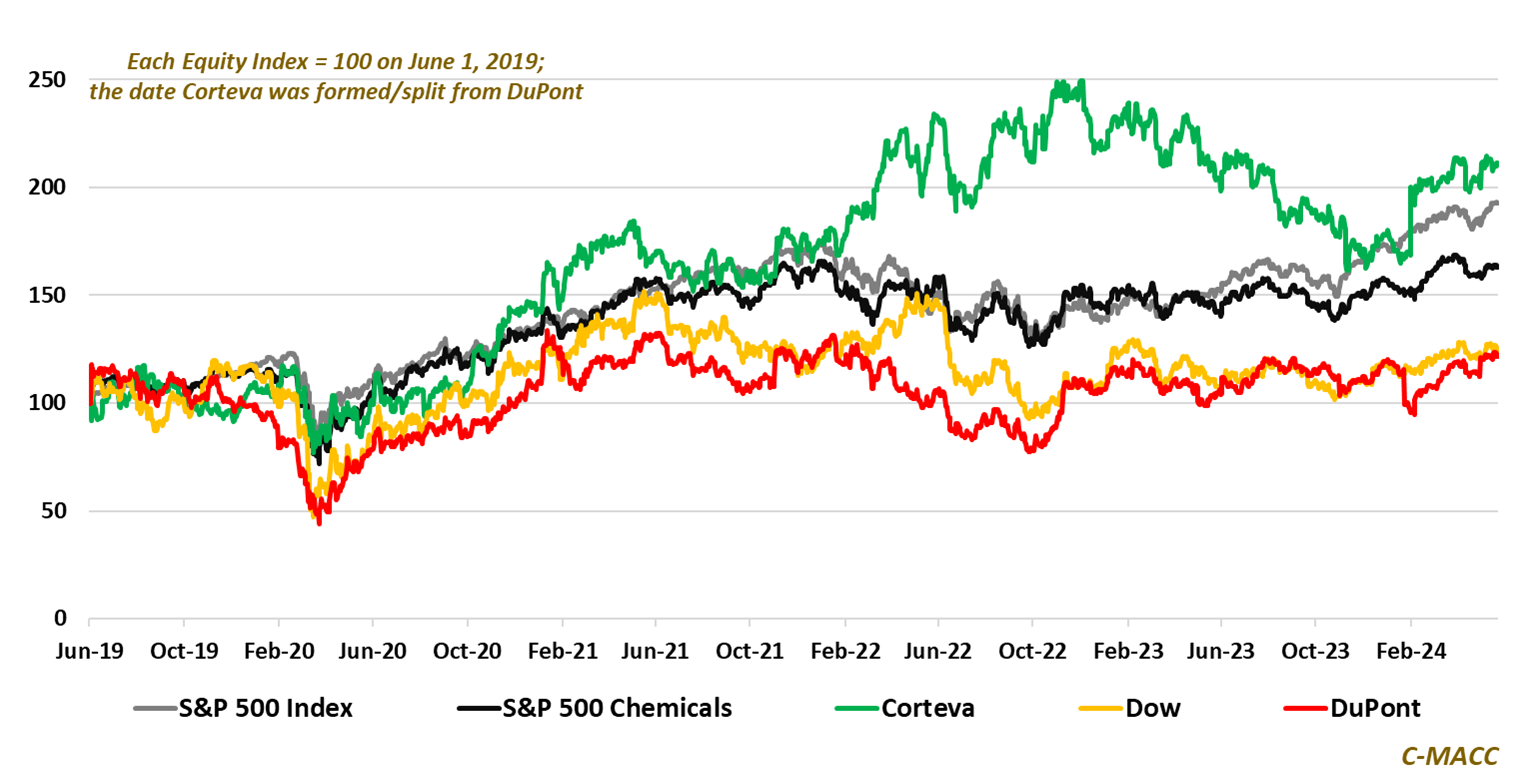 Exhibit 1: DuPont has underperformed Corteva, Dow, the S&P 500, and S&P 500 chemicals index since June 1, 2019.