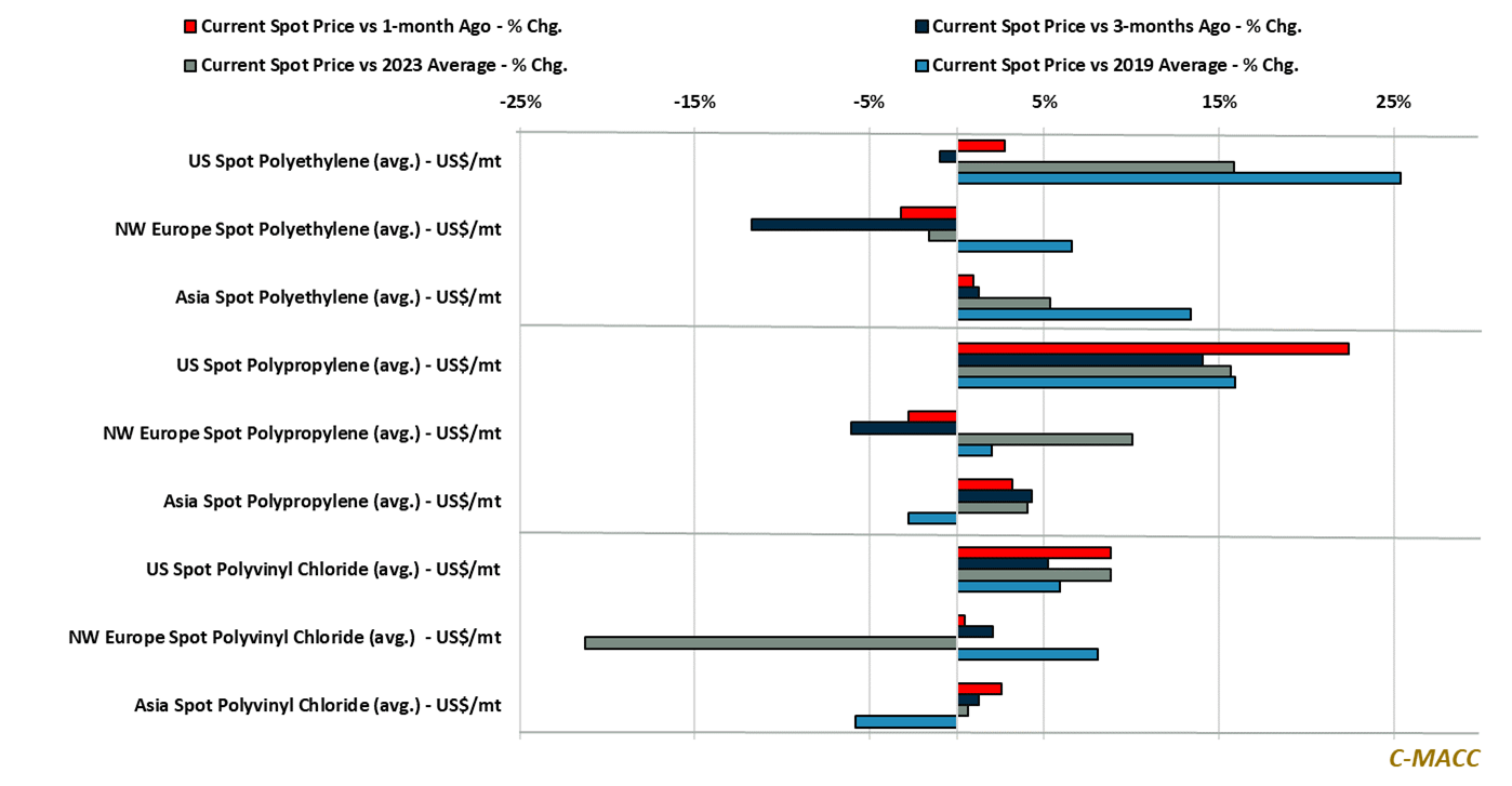 • Polymer Market Trends: We flag price strength in US spot polyethylene (PE) and polypropylene (PP) relative to their 2019 and 2023 averages and why less downside risk faces US spot polyvinyl chloride (PVC) near term.