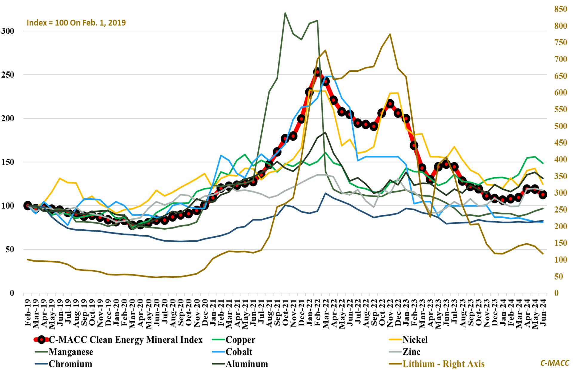 - General Thoughts: The C-MACC Clean Energy Mineral Index declined ~5.5% in June to now reflect gains of ~4% YTD following a ~53% YoY decline in 2023 – recent weakness is keeping optimism for tighter markets in 2H24 in check.