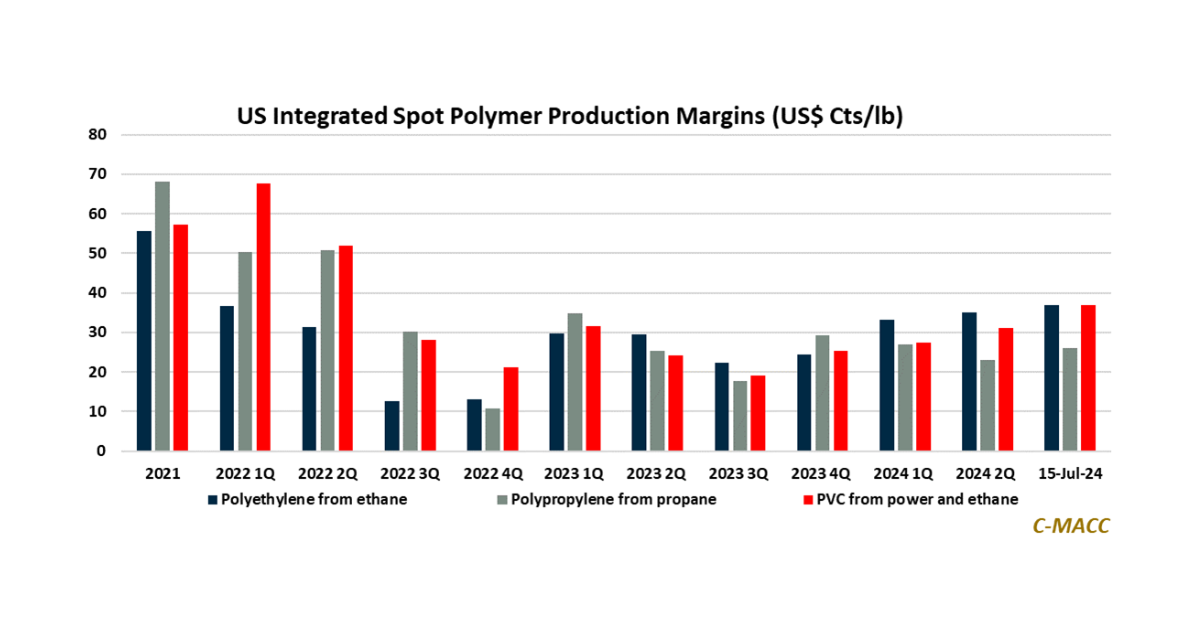 Base Chemical Global Analysis Can They Hold On? – US Spot Integrated Polymer Margins Near YTD Highs, Europe Chemical Prices See the Most Strength WoW Chemical Market Trends: US integrated spot polymer margins rose into 3Q24 amid global price strength and upstream feedstock cost relief, creating a favorable setting for July 15, 2024 No Comments