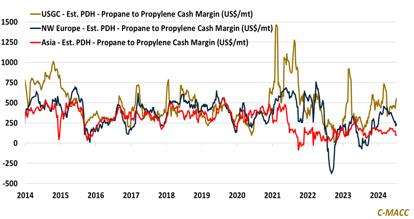 - General Thoughts: US spot ethylene and propylene production margins significantly strengthened in July, and we discuss why we see more risk in US spot propylene derivative prices relative to ethylene derivatives in 2H24.