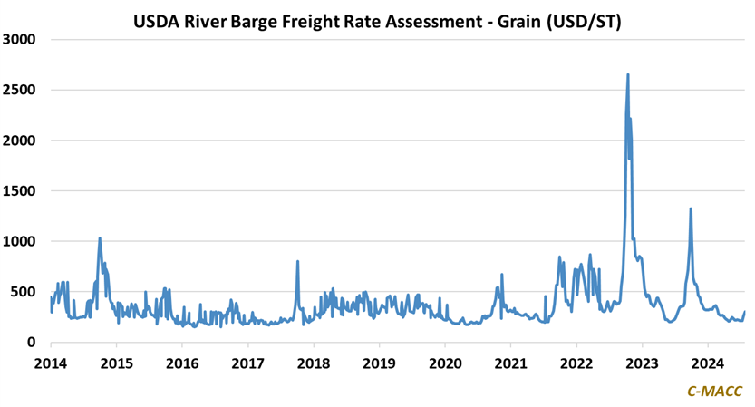 - Downstream/Other Chemicals: Elevated global freight rates are benefiting shippers, as shown with the Maersk profit guidance increase for 2024, but it is posing an elevated cost for US agriculture exports into some markets.
