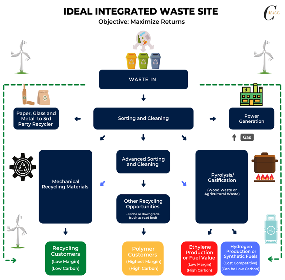 Trying to get a small amount of adequately pure and clean polymer from a large waste stream to satisfy a focused customer need (food-grade recycled polyethylene, for example) is inherently very expensive. Optimizing the use of the full waste stream could provide much cheaper plastic. The overall challenge with our “ideal” waste site above, is that no one is interested in managing the whole system. Different companies want different pieces or have technologies that can address different aspects of the challenge. The efficiency would come from managing the whole process holistically, optimizing each step to drive the most value for the lowest cost. Simpler still would be a heterogeneous waste stream feeding as a gasification process with a syngas output – many have tried, but all so far have failed, or failed at a cost that makes sense.