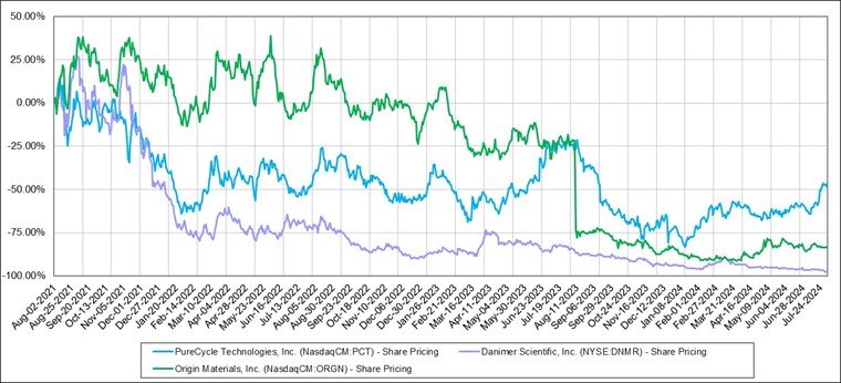 But at the other end of the spectrum, the fortunes of PureCycle suggest that trying to refine a recycling process that is targeting just one polymer is unlikely to succeed. PureCycle is having challenges with technology, access to feed and overall economics. As the charts below note, the stock is doing better than the financials would suggest, especially relative to others.