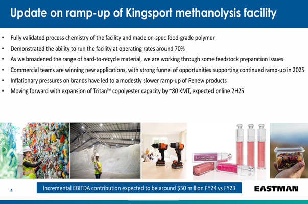 Exhibit 26: Eastman provides an update on the ramp-up of its methanolysis facility in Kingsport with 2Q24 results.