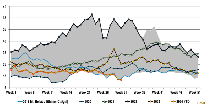 - General Thoughts: USGC ethane prices declined to a fresh YTD low and fell relative to Ex-US naphtha values this week, further lifting the North American ethylene production cost advantage favoring many Ex-US asset reviews.