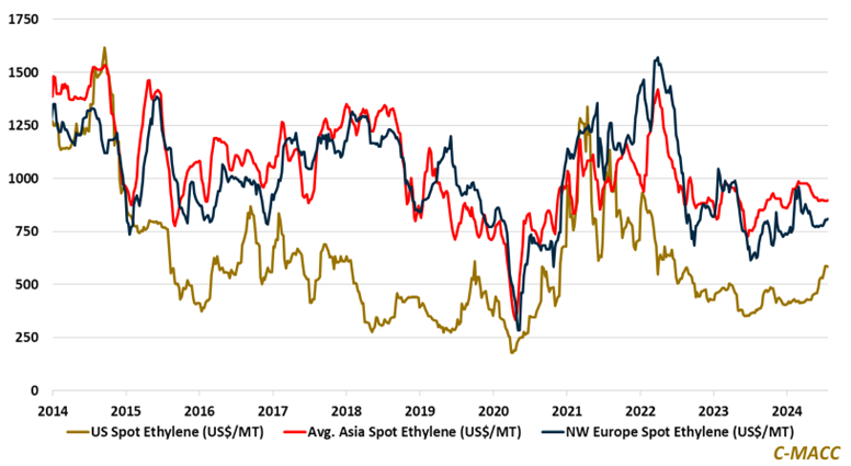 Exhibit 5: US spot ethylene margins hit a fresh 2024 YTD high this week; Europe and Asia remain under pressure.