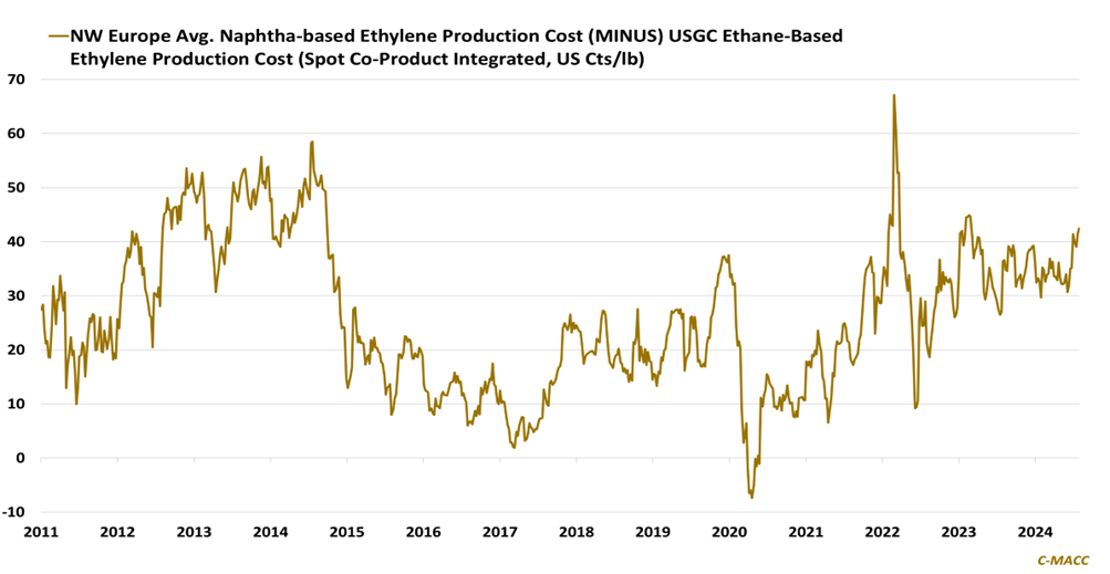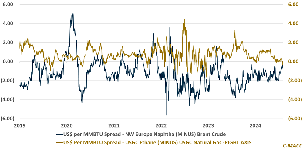While it is not clear that crude oil prices will fall, and you can make a strong case for them rising, it is likely that US natural gas prices will rise. We will likely need more production from the Marcellus to meet LNG demand and the Marcellus and other gas rich plays are not profitable with pricing below $3.00 per MMBTU – see Chesapeake’s Q2 2024 expectations/results. NGL prices will rise with natural gas prices, but unless infrastructure to consume the NGLs is built, they will remain in surplus and at a discount to fuel value – remember that the Marcellus is NGL rich and the further you move West in the formation (as a rule of thumb) the more NGLs. Competition between LNG facilities, local utilities, and methane-based chemicals (including what could be a wave of blue ammonia by 2035) could drive up US natural gas prices, and close the arbitrage suggested in Exhibit 1. Still, the ratios could move a long way before the cost advantage in the US shrank too far. Plus, this still does not get away from the likely very large surpluses of NGLs, especially ethane. As the chart below notes – we already have a surplus, and in Exhibits 4 and 5 we show how a lower ethylene spot price in the US still creates a much higher ethylene margin.