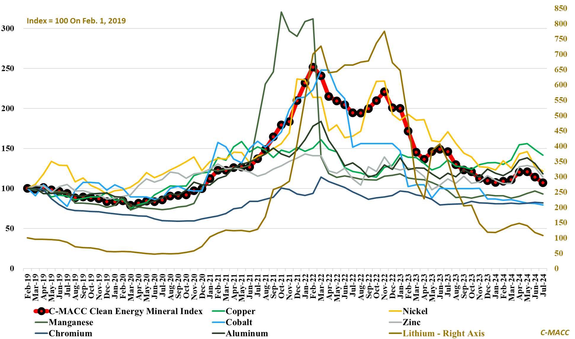 Exhibit 1: The C-MACC Clean Energy Mineral Index fell ~6% in July, now down ~2% YTD after a ~53% decline in 2023.