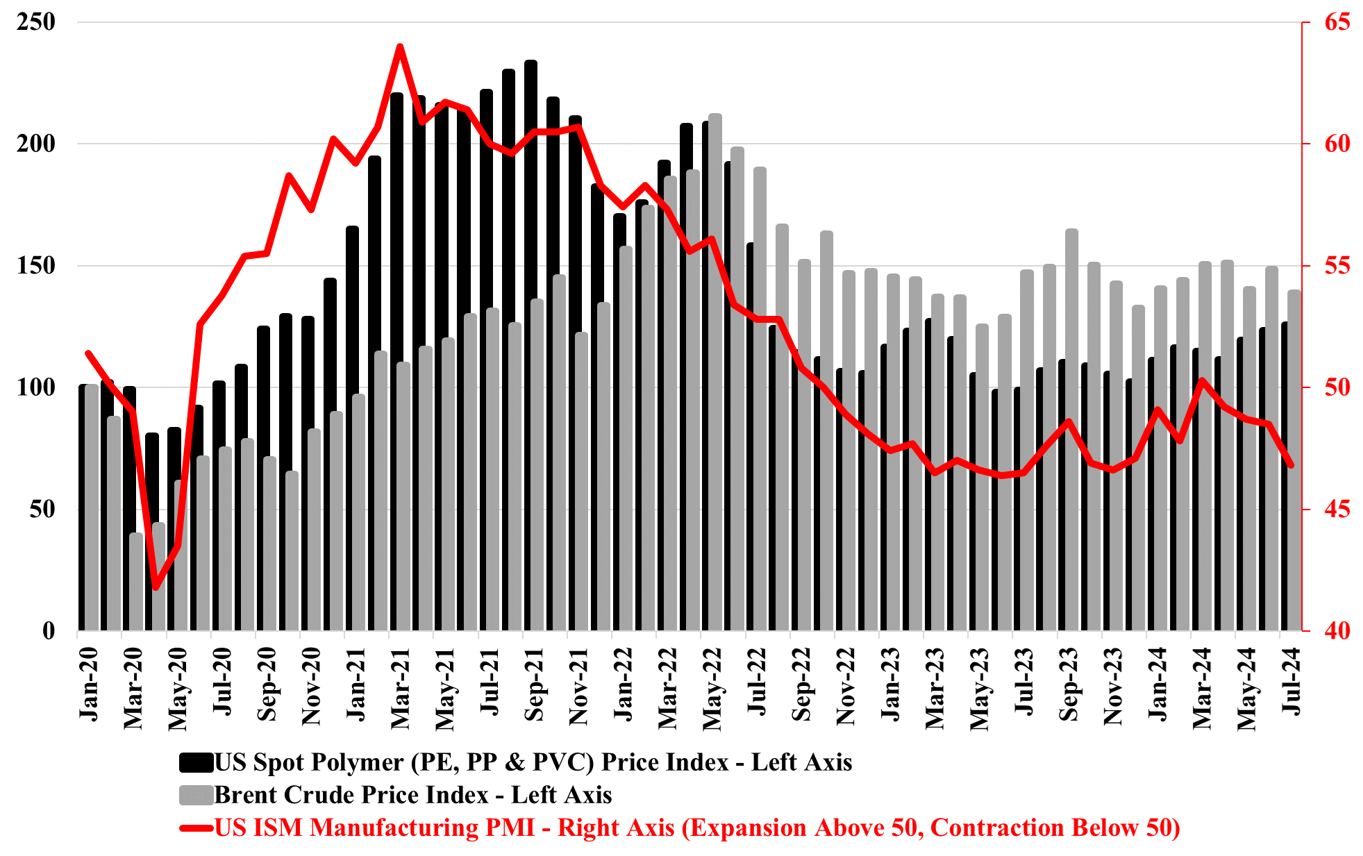 Exhibit 1: Brent crude oil weakness MoM in August, declines in US (& global) manufacturing, and prospects of increased supply to put downward pressure on domestic spot polymer prices in 2H24 absent unplanned outages.