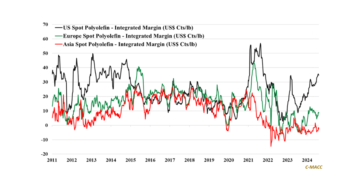 Global Market Analysis Western Spot Polyolefin Margins Rise in August Amid Supply Concerns, Capacity Is Not the Issue! General Thoughts: US integrated spot polyolefin margins reflect YTD highs and levels above the high end of the 2023 and pre-COVID 2016-2020 range – we August 20, 2024 No Comments