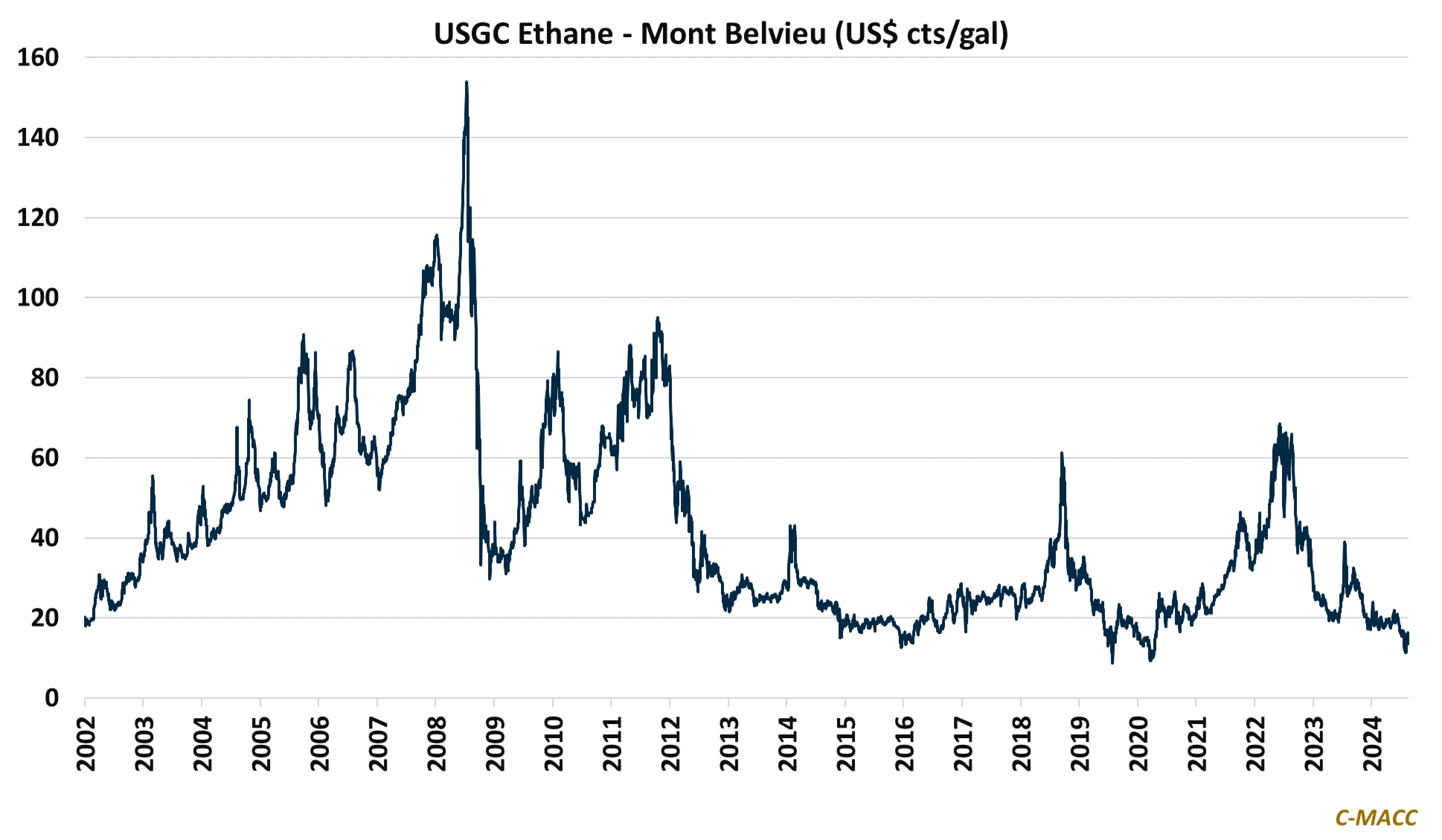 - General Thoughts: US ethane values near YTD lows and at the low end of the 2002-2024 range mean one thing (considering much higher ethylene feedstock costs abroad) – US ethylene producers are in an enviable position.