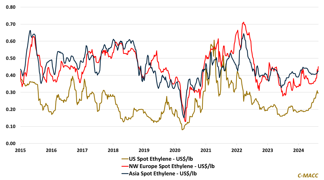 - General Thoughts: We think recent factors favoring global commodity chemical price support will lessen in late 3Q24 and into year-end, and absent a major disruptive event, such as a USGC hurricane, spot prices will likely fall.