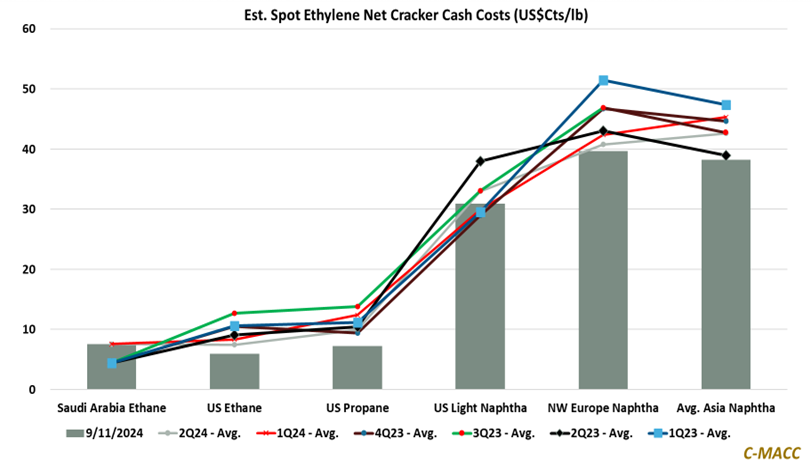 - Energy/Upstream: The North American and Middle Eastern cost advantages in producing ethylene (& PE) are significant relative to Asia and Europe, providing a margin buffer amid weak global prices – is it as good as it gets?