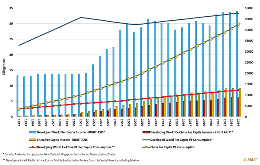 - Downstream/Other Chemicals: We discuss PE demand per capita in China climbing to reach levels near those in developed economies in 2024 while per capita income in China remains much closer to developing world levels.