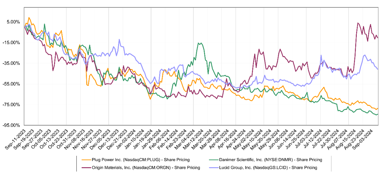 At the current share price, Plug would need to sell close to 145 million shares to raise $250 million, which may be what is needed to get from here to the end of the year without running out of money. But another equity raise of that nature will likely drive the share price even lower, assuming there are buyers – the secondary in July may have been seen as less destructive than trying to raise the same amount of money daily through the ATM. The constant selling pressure caused by an ATM, especially when there is no other positive company news, can drive the share price down incrementally each day. In the share price chart below, we show a few companies that are struggling with cash flows and running short of options to raise more money. However, some have found self-help and others have investors who are keeping the faith. The rebound in Origin Materials stock, while not that significant, reflects a change in corporate strategy to exploit a possible shorter-term opportunity, away from the original plan, but targeting a fast path to cash flow positive (note that C-MACC owns Origin Material in its corporate brokerage account). This is a fortuitous discovery that Origin had on the back burner, but given the reality of the current financing market, Origin has been able to adapt, assuming the PET caps business takes off. Lucid still has a funder in the Saudi Arabian sovereign wealth fund but continues to bleed cash and is effectively doing the same as Plug, issuing equity to cover losses. Plug Power and Danimer Scientific are likely past the point of no return, although Plug has yet to mortgage the assets, while Danimer has now borrowed against everything.
