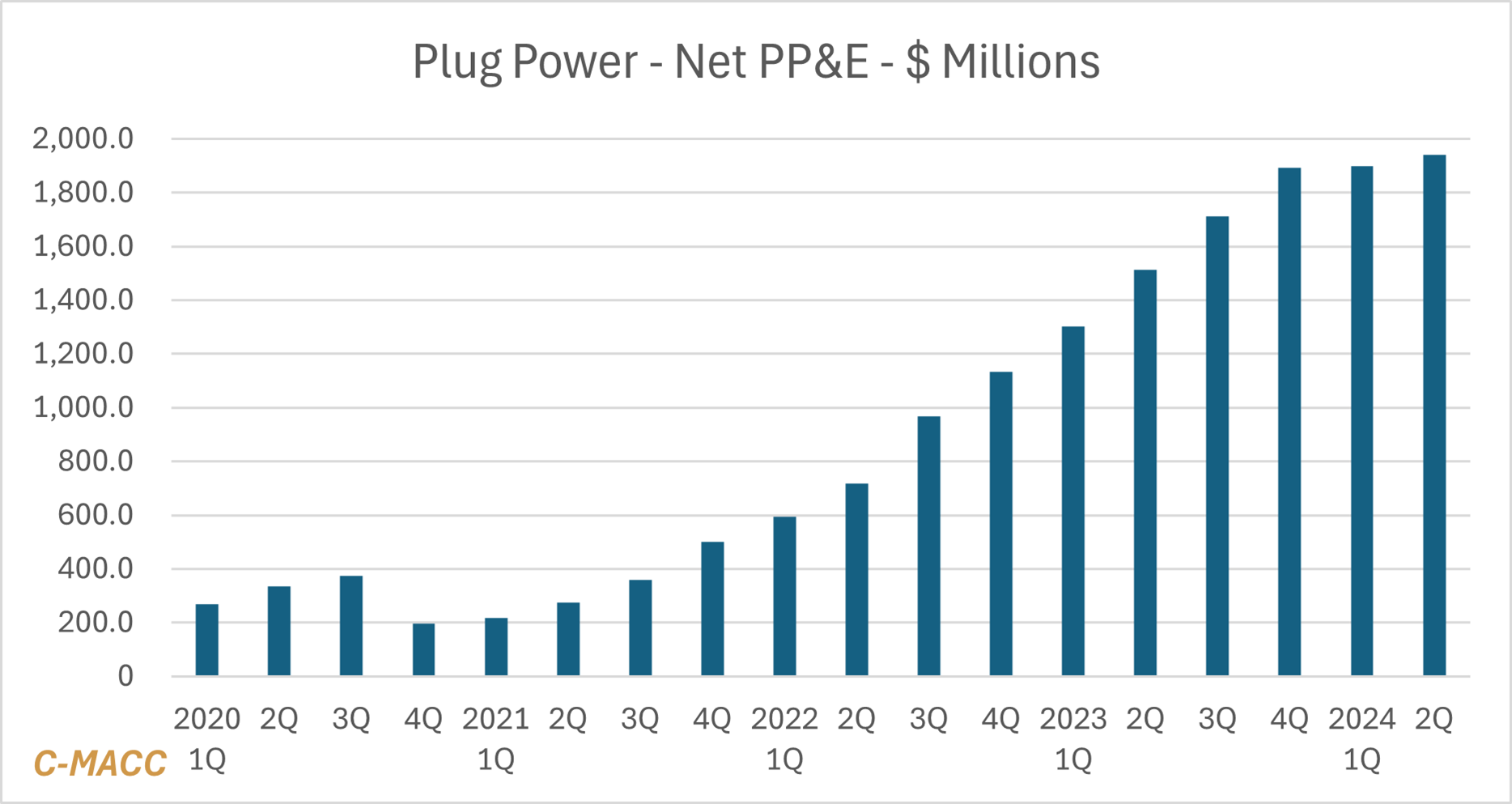 Borrowing against the assets is still an option for Plug Power, but it is a last resort. The assets to be considered would include the net plant and equipment – see the exhibit – and any IP, where the value is hard to quantify. The more PEM electrolyzer manufacturers that hit the market the lower the potential value of any IP any of them might have. Also, if the plant and equipment is manufacturing capacity that is incomplete or unproven, the perceived value will fall and the amount anyone is willing to lend against it will also fall. In the chart below, note that the net PP&E has not grown since the company started raising more equity. It would be very coincidental if the capital program ended at the same time – more likely, Plug does not have the cash.