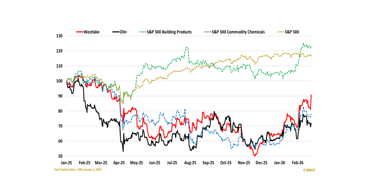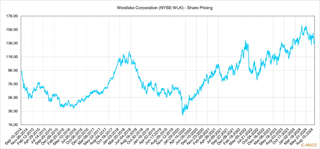 Expecting more deals like this is probably a long shot, even if the markets need significant restructuring, especially in Europe. ADNOC is paying a lot and paying in cash, and as such is taking a lot of market risk, especially with the very large part of the Covestro portfolio that is in Europe and especially in Germany. Cash deals are challenging in markets like these as the buyer needs to be able to fund the acquisition without taking on too much capital structure risk – the Dow/Rohm and Haas deal in 2008/2009 is the best example of how market fundamentals can turn what looks like a good deal very sour very quickly. The way to risk-adjust valuation challenges is to trade for stock rather than cash, but sellers always want to give their shareholders certainty, and the Dow experience is still a recent industry lesson. Note that when Westlake bid to buy Axiall, the first offer was stock or cash or a combination of both. Axiall insisted on cash, but with hindsight, the stock deal would have been meaningfully better for Axiall shareholders. The benefit is understated in the chart below as a stock deal would have meaningfully increased the liquidity of Westlake’s stock at the time and this would have likely added more momentum. Axiall understood this, but the “bird in the hand” view of cash was compelling and risk free.