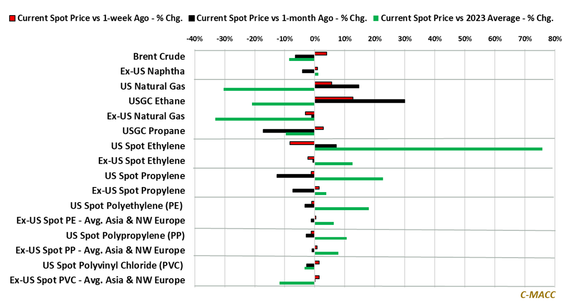 • Chemical Market Trends: Global spot ethylene prices fell WoW, with US spot ethylene values declining more than Ex-US values – US spot levels, absent unplanned events, will likely fall further toward 2023 average levels.