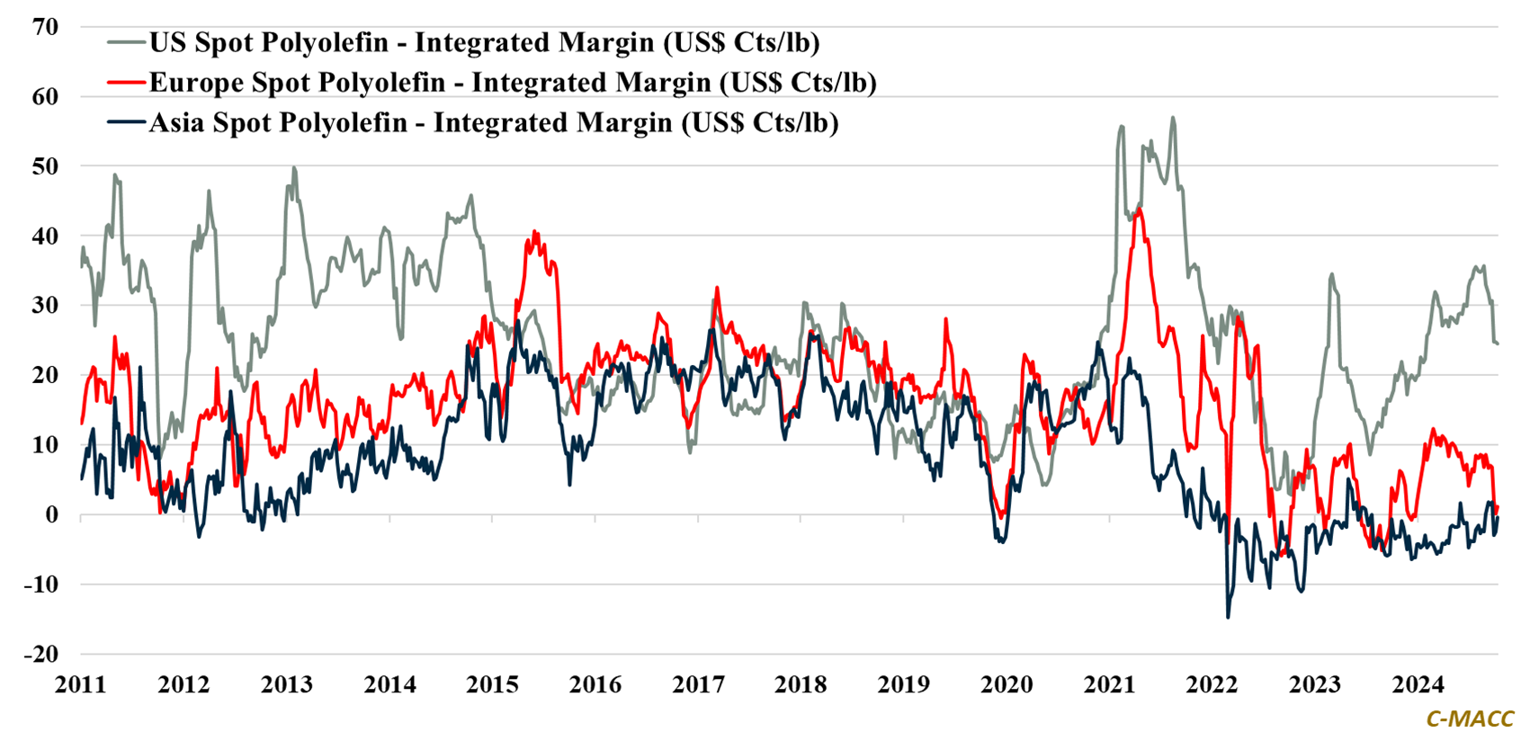Exhibit 1: US spot integrated polyolefin margins reflect significantly higher levels than most of Europe and Asia.