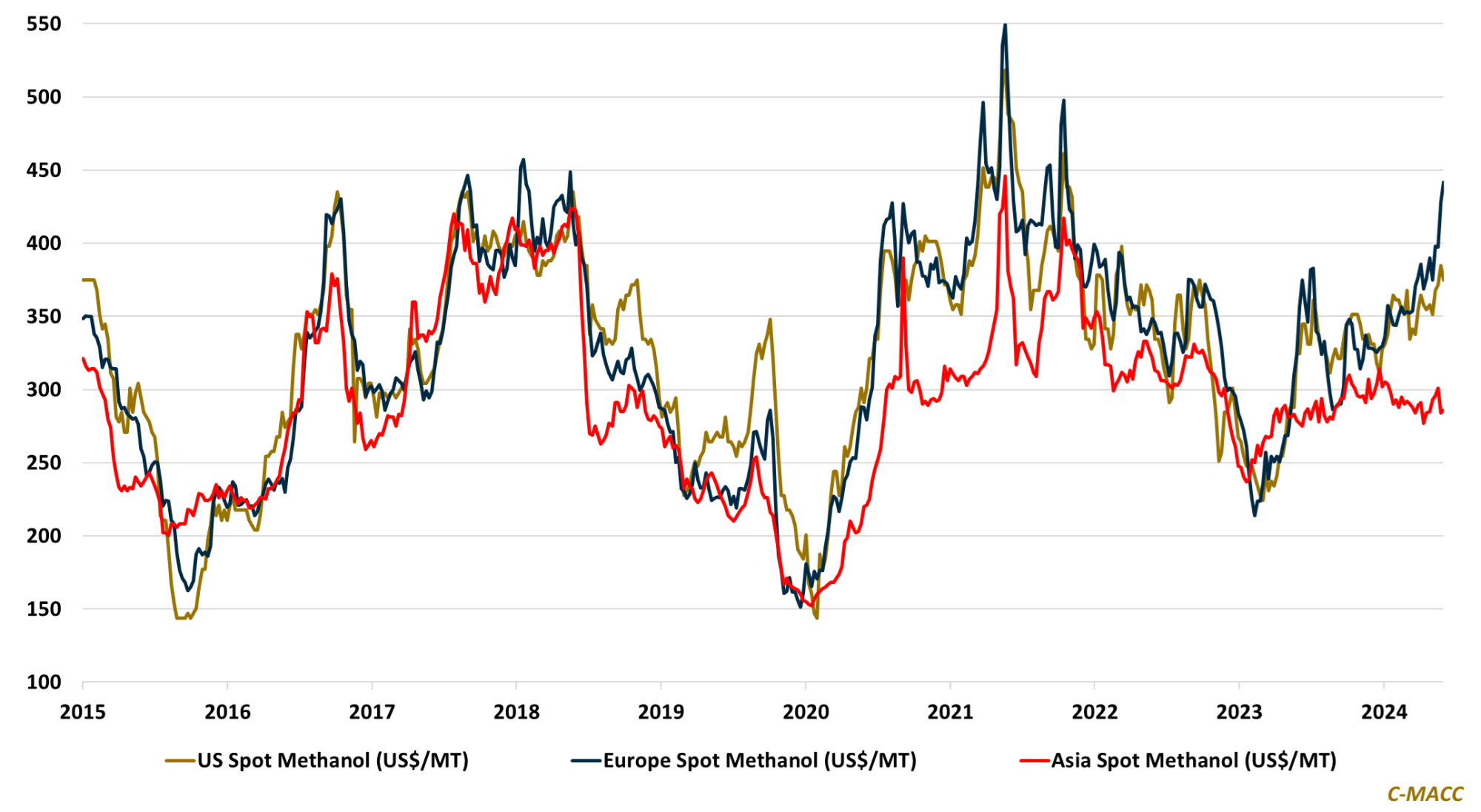 Exhibit 1 – Chart of the Day: NW Europe methanol has surged to a YTD and multi-year high relative to the US and Asia.