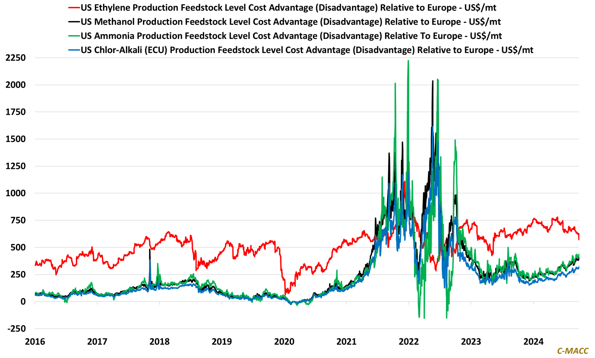 Exhibit 1: The US ethylene production cost advantage has recently fallen relative to Europe, while the cost advantage in US Methanol, Ammonia, and Chlor-alkali has relatively expanded due to higher overseas natural gas costs.