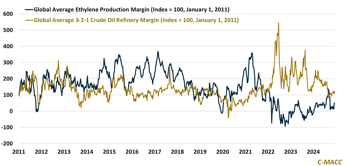 Exhibit 1: Global average refinery and ethylene production margins have rebounded from their 2H24 lows.