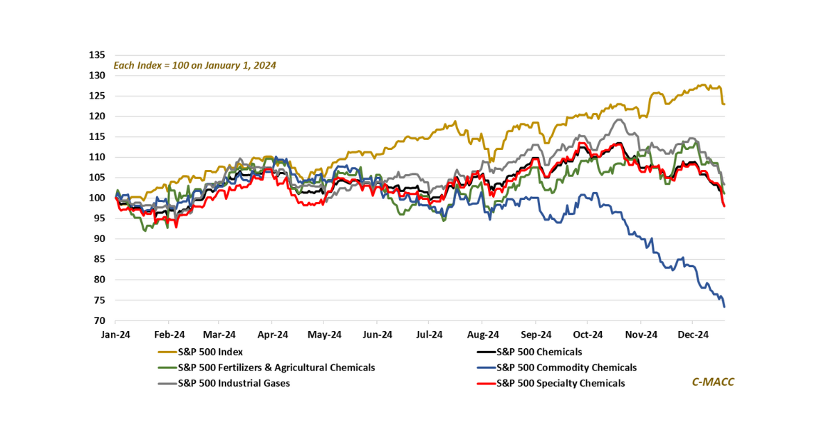 Global Market Analysis Set ‘Em Up Joe – Commodity Chemicals Fell Off the Wagon in 4Q24; Intervention Needed for A Better 2025 General Thoughts: US commodity chemical equity values slid lower in 4Q24 with market fundamentals, notably underperforming the chemicals sector and overall market in 2024 – December 20, 2024 No Comments