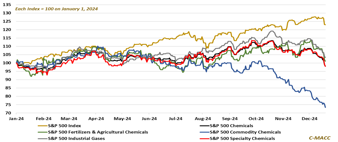 - General Thoughts: US commodity chemical equity values slid lower in 4Q24 with market fundamentals, notably underperforming the chemicals sector and overall market in 2024 – we provide our views of 1Q and full-year 2025.