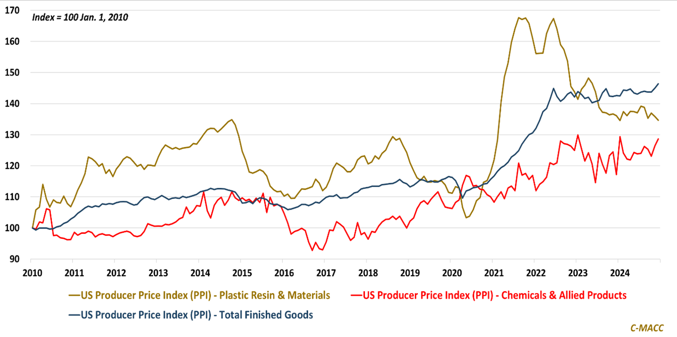 • General Thoughts: We discuss the downward trend in the US plastics PPI relative to the chemicals PPI, supporting the case for upstream integration, and the record China trade surplus in 2024 that could increase further in 2025.
