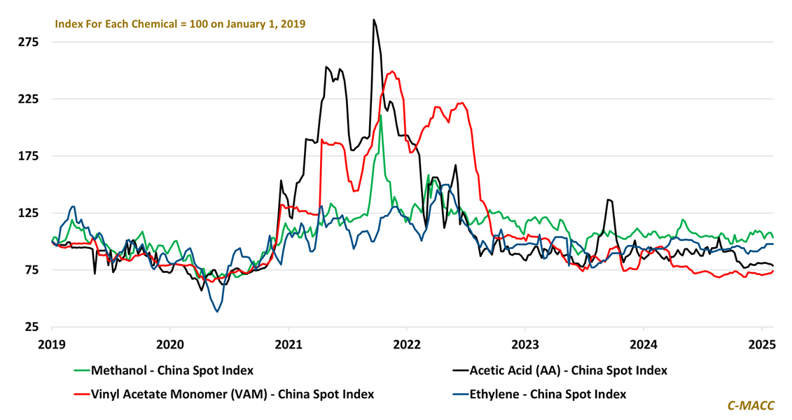 Exhibit 1: China spot vinyl acetate monomer (VAM) and acetic acid (AA) weakened relative to methanol in 2024.