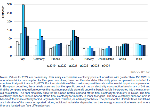 Exhibit 1: IEA estimated final electricity prices for large industrial consumers in energy-intensive industries.