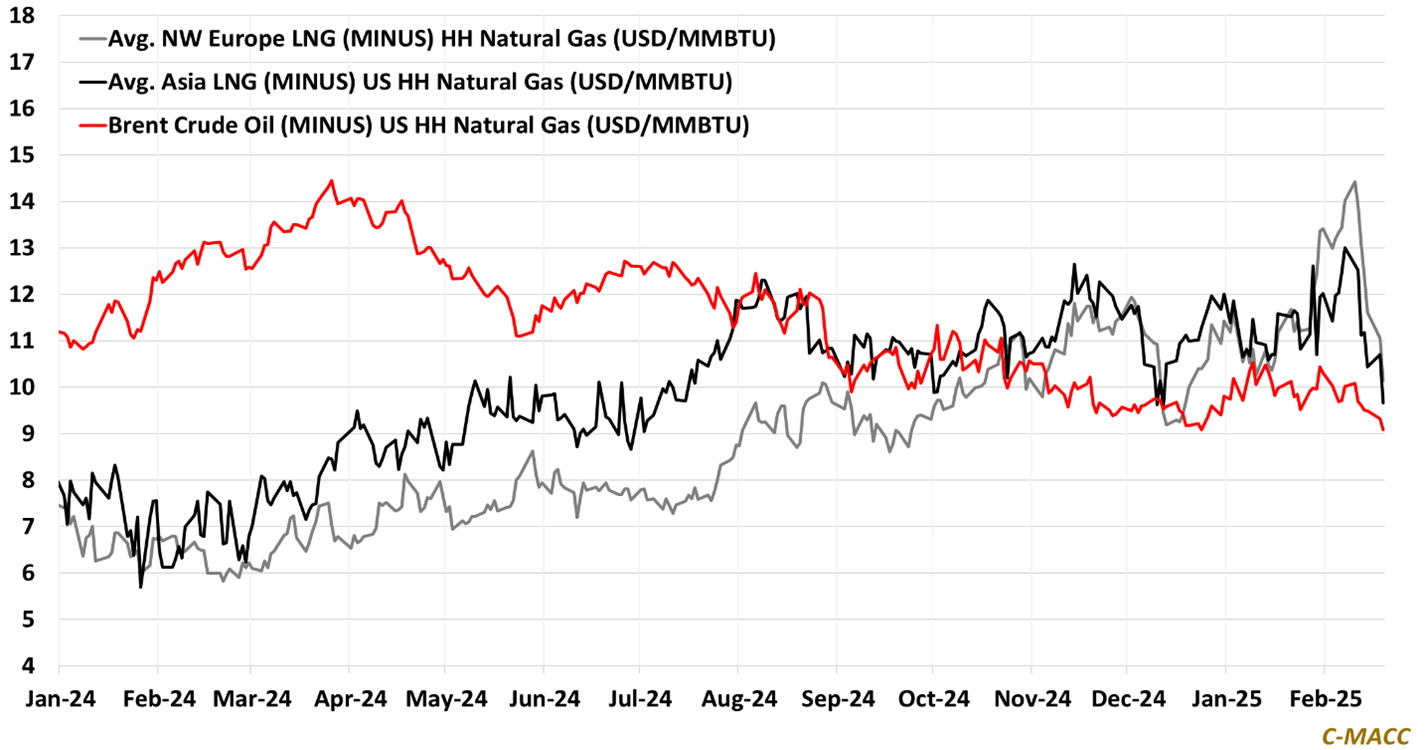 Exhibit 1: US natural gas prices have risen relative to European and Asia natural gas and Brent crude oil in February.